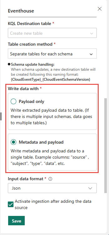 Screenshot that shows the eventhouse configuration pane with the options for writing data.