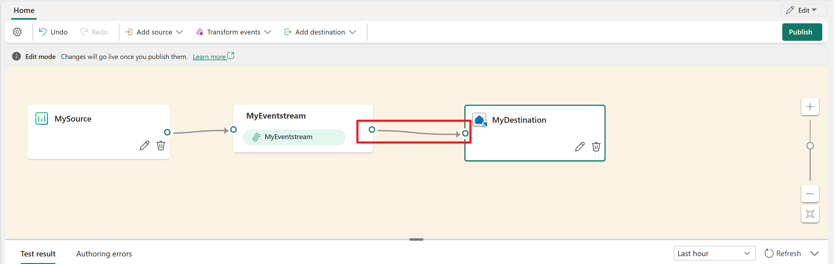 6. Connect the new Eventhouse destination card to the output of your eventstream if not already connected, and then select Publish.