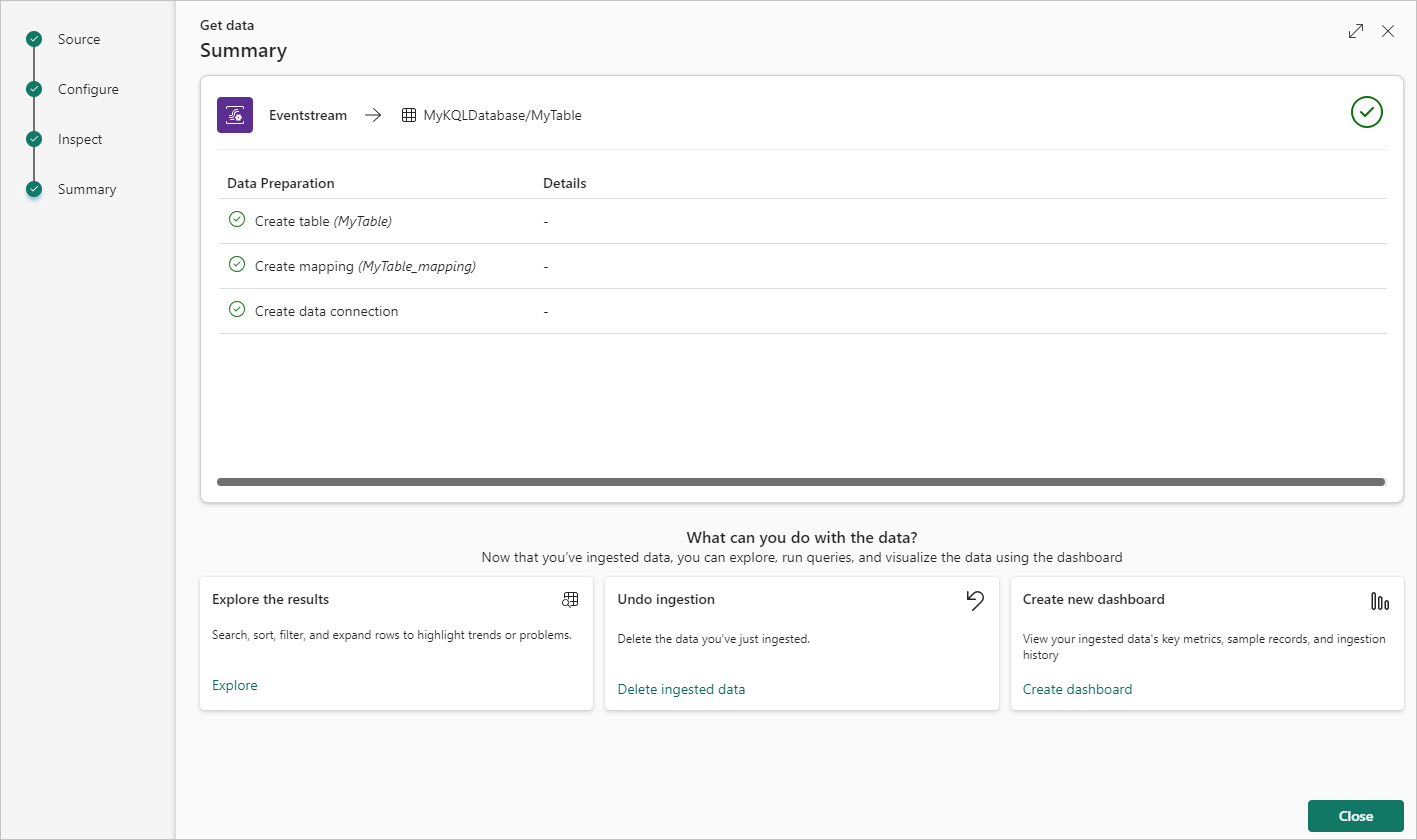 13. On the Summary screen, review the details and status of your data ingestion, including the table with the schema you defined and the connection between the eventstream and the Eventhouse. Select Close to finalize the Eventhouse setup.