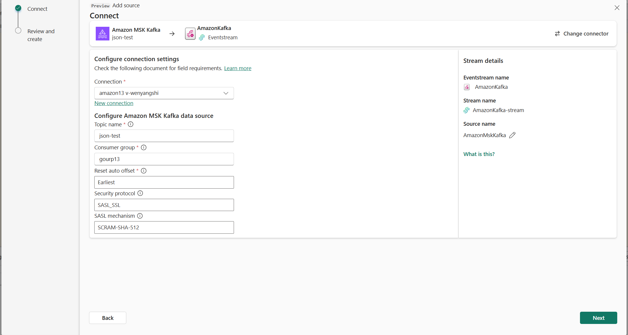 To preview events from this Amazon MSK Kafka source, ensure that the key used to create the cloud connection has read permission for consumer groups prefixed with "preview-".