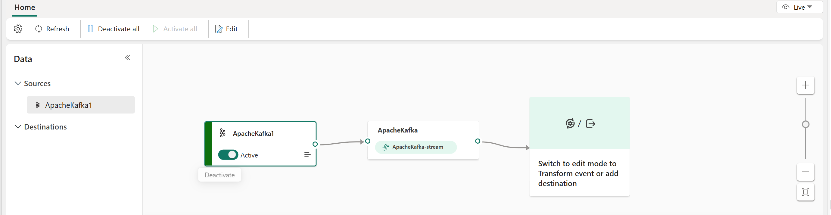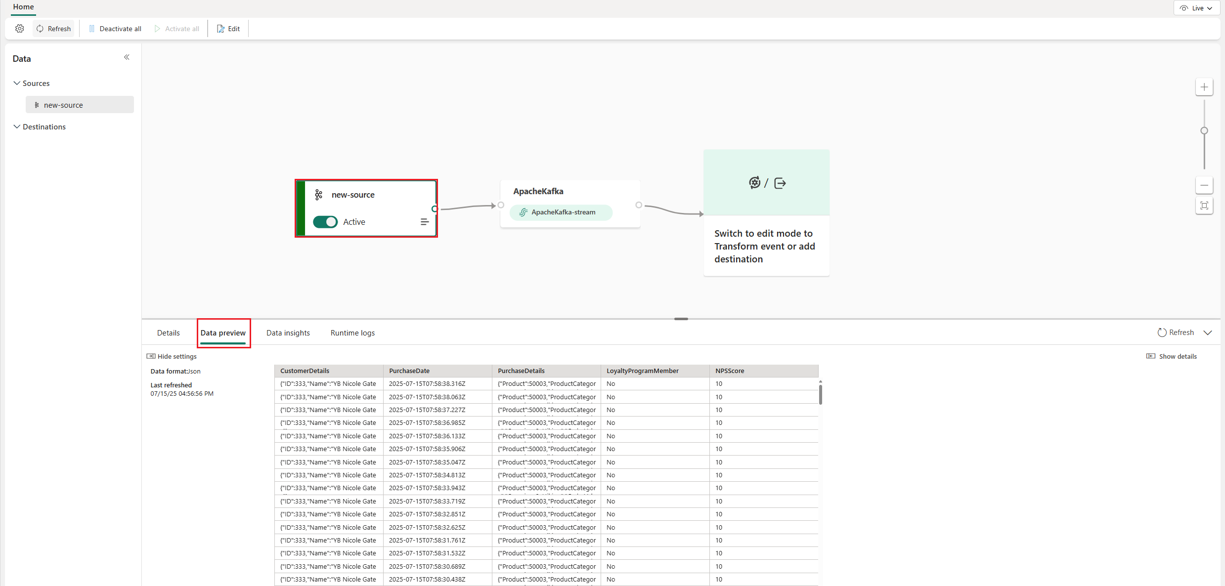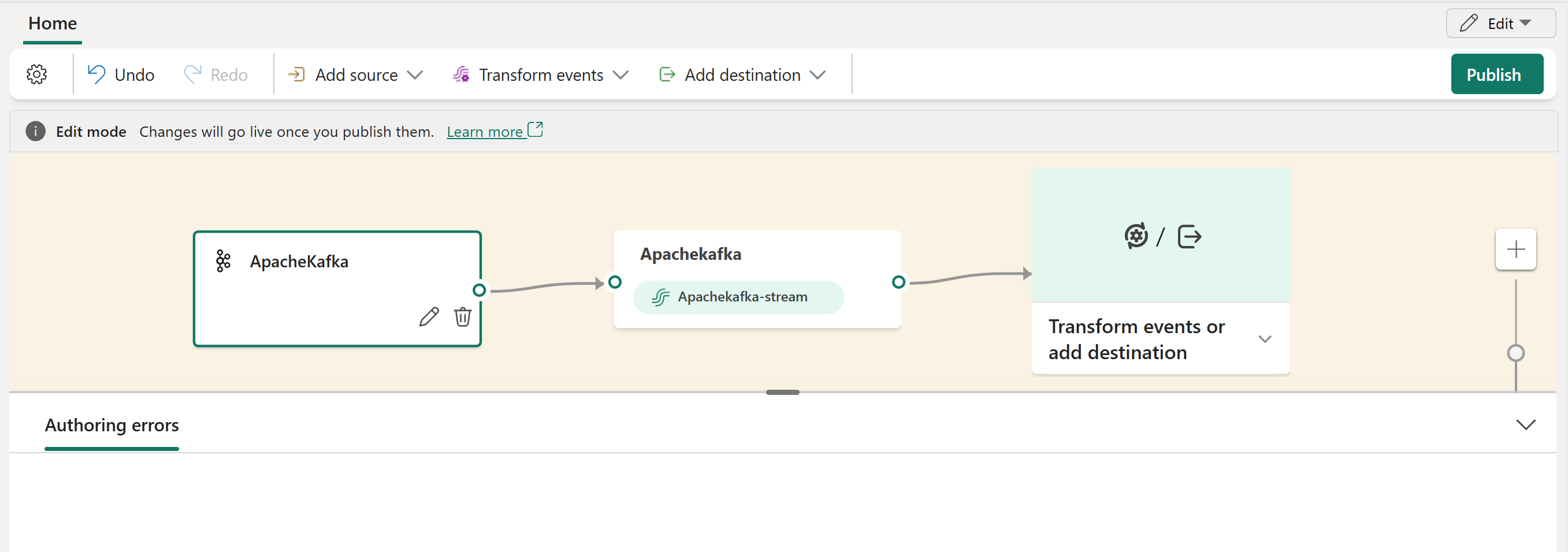 You can see the Amazon MSK Kafka source added to your eventstream in Edit mode.