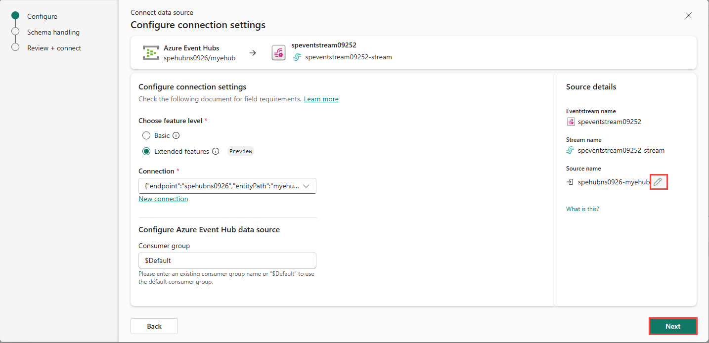 On the Configure connection settings page, for Choose feature level, select Extended features.
