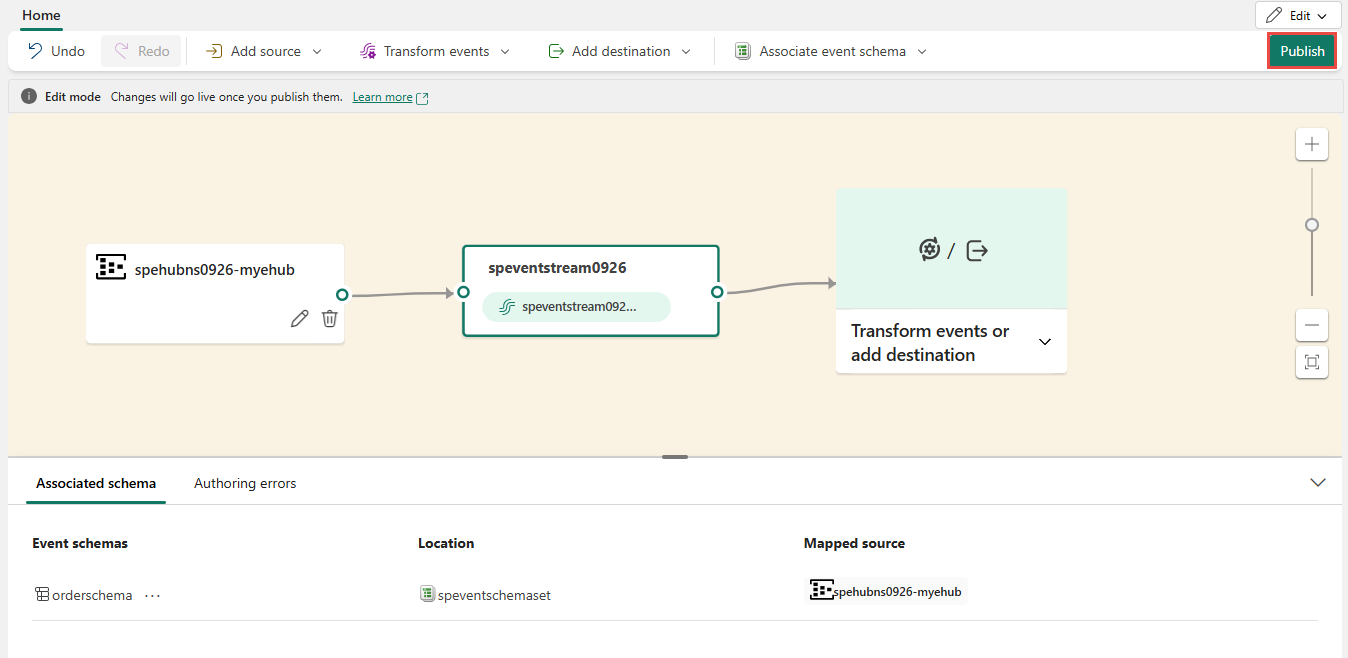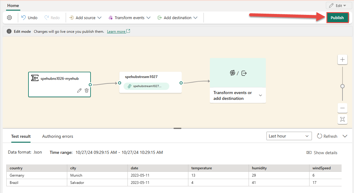 Confirm that the Event Hubs source is added to your eventstream on the canvas in the Edit mode. Select Refresh to display a preview of the data in the event hub. To implement this newly added event hub, select Publish on the ribbon.