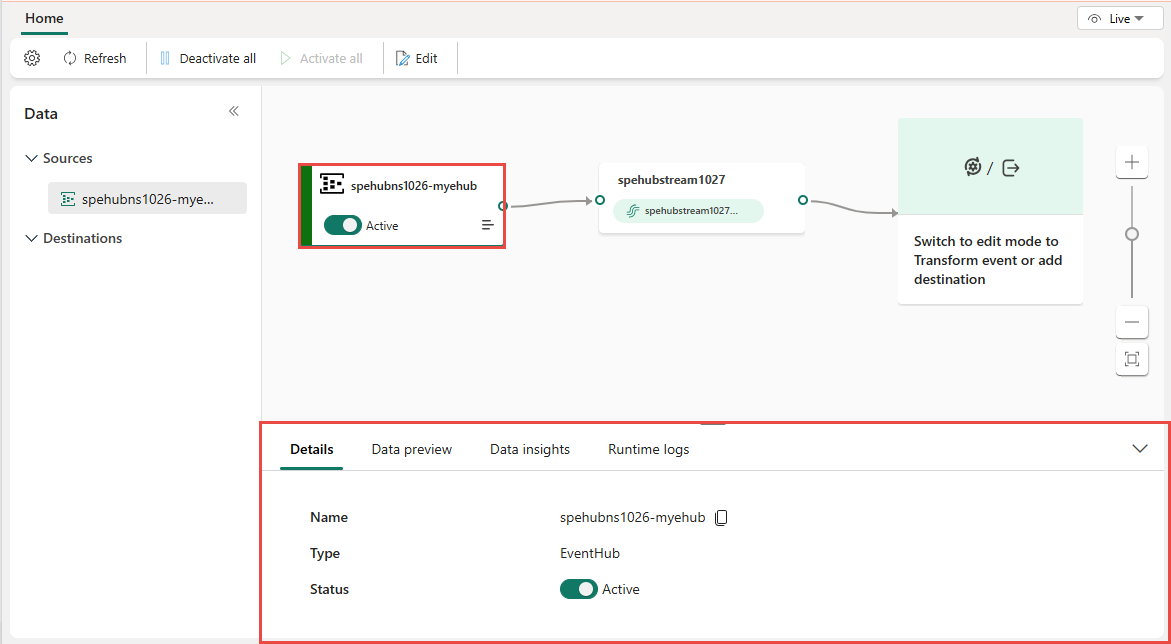 The event hub is available for visualization in the Live view. Select the Event hub tile in the diagram to open a pane that's similar to the following example.