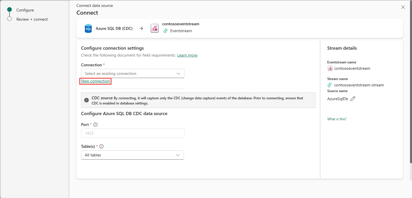 Screenshot that shows the review + connect page for the Azure SQL Database CDC source.