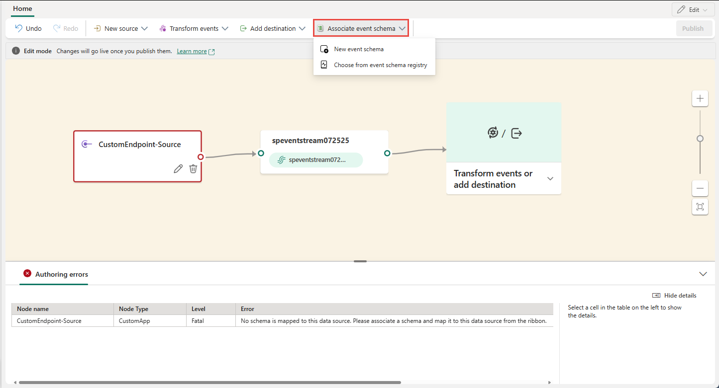 In the editor, to associate with a new schema or an existing schema from a schema registry, select Associate event schema on the ribbon.
