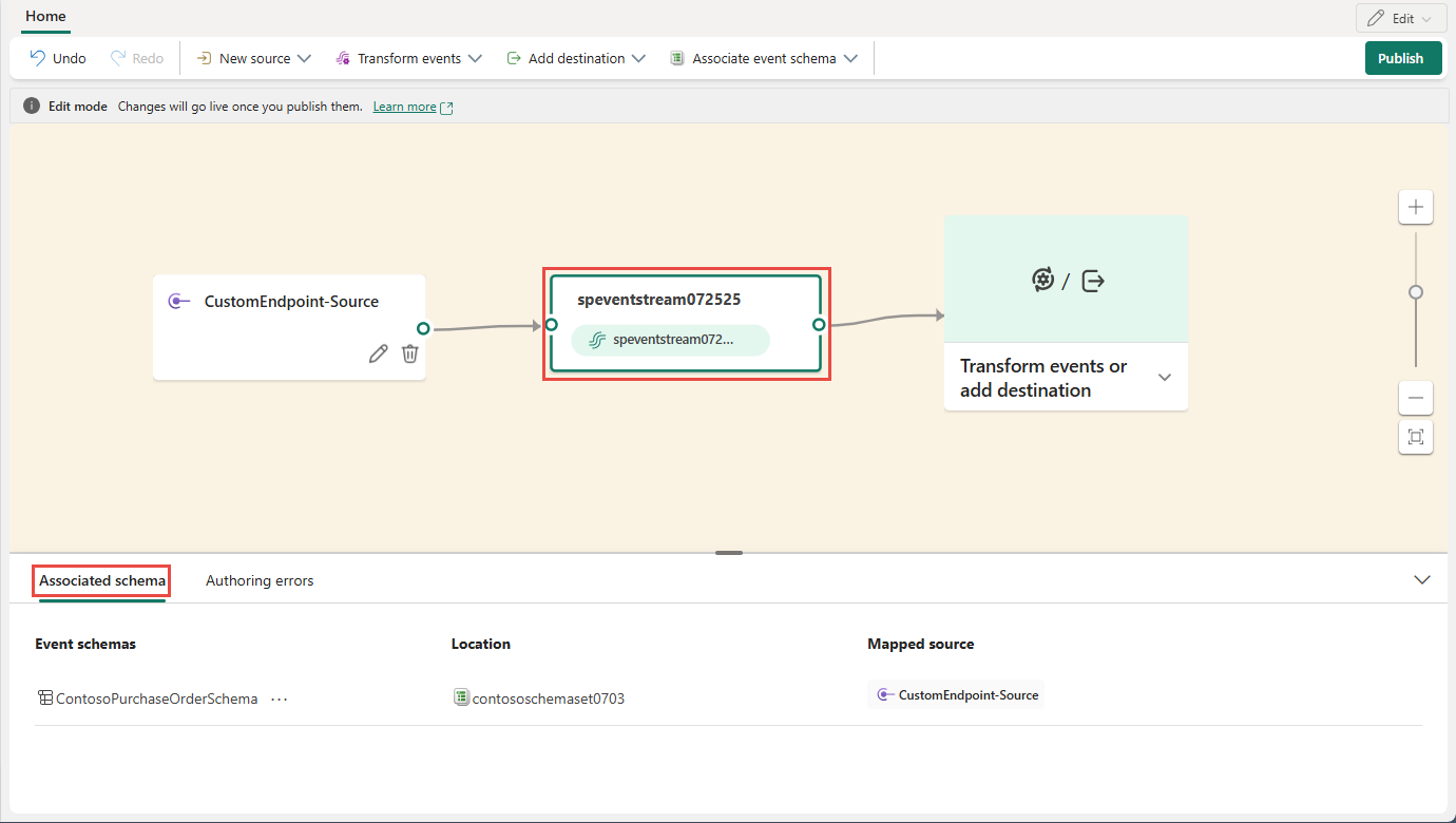 After you create the custom endpoint source, it's added to your eventstream on the canvas in edit mode. To implement the newly added data from the custom app source, select Publish.