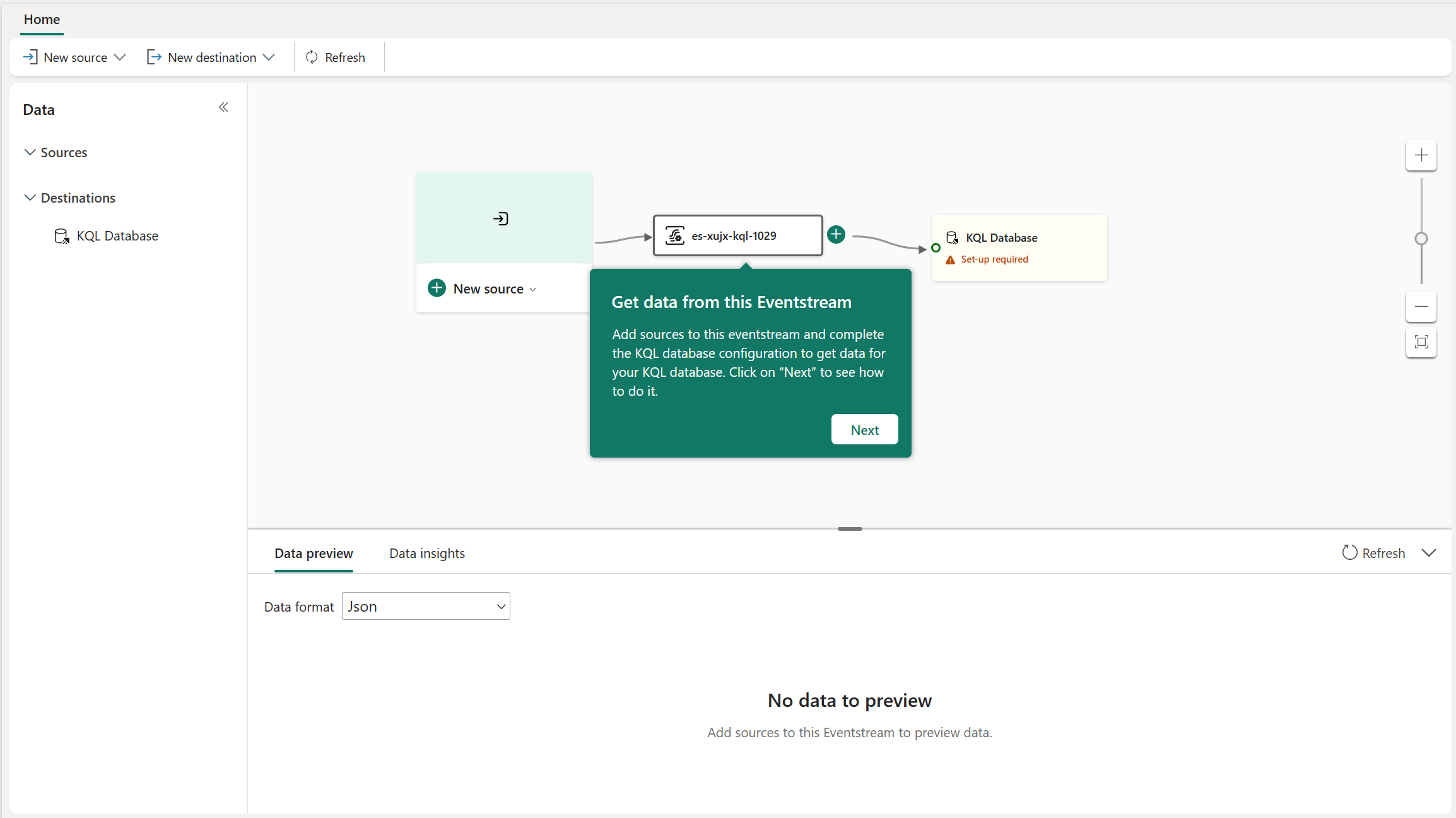 The new eventstream opens with teaching bubbles. By following the guidance in these teaching bubbles, you can get the data from this eventstream and add it to your KQL database.