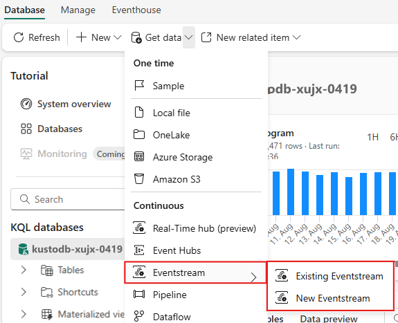 To get data from an eventstream and add it to a KQL table inside a KQL database, select Get data on the ribbon of your KQL database. Two options are available: Existing Eventstream and New Eventstream.