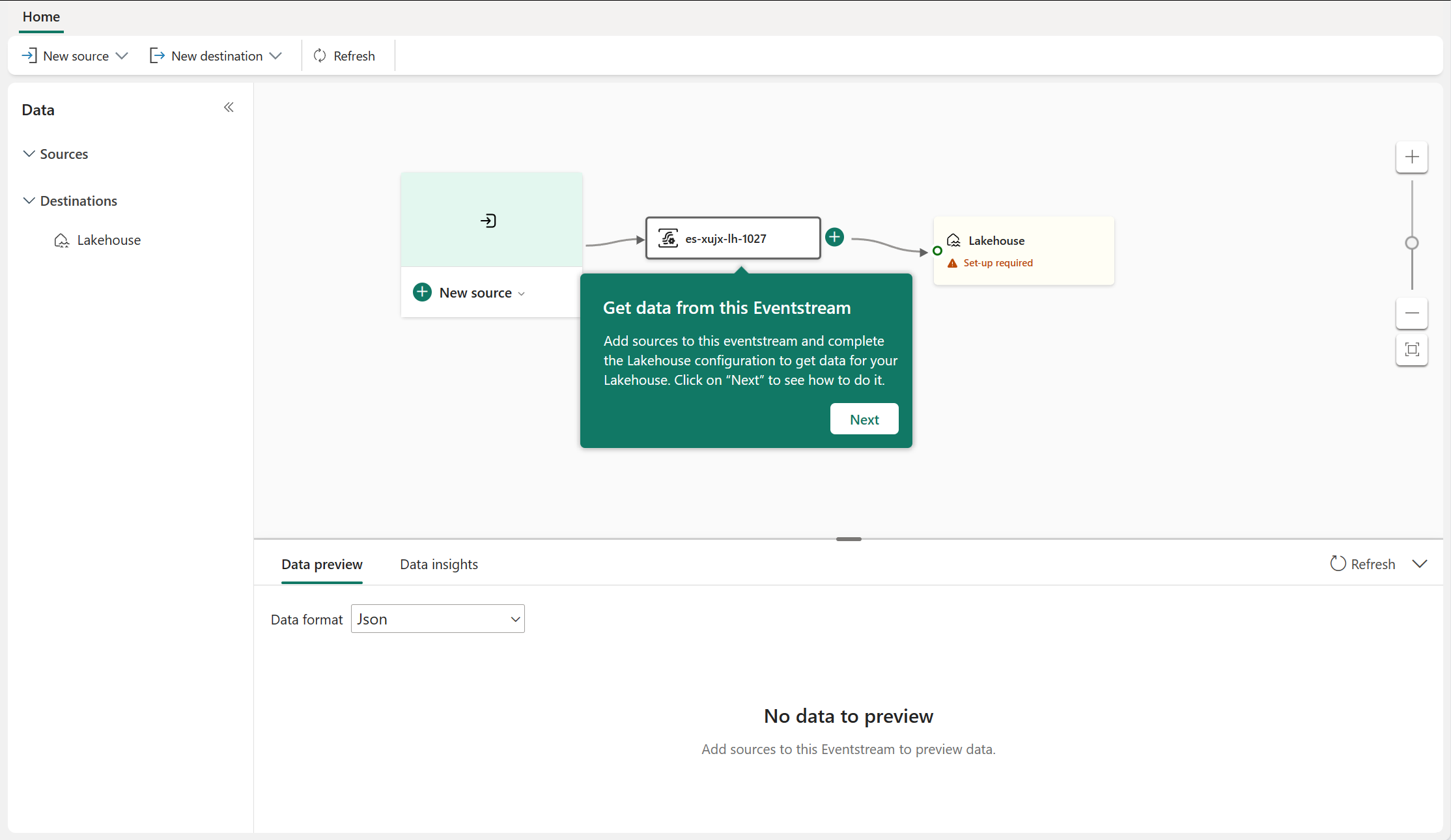 On the canvas for the new eventstream, follow the guidance in the teaching bubbles to add the data to your lakehouse.