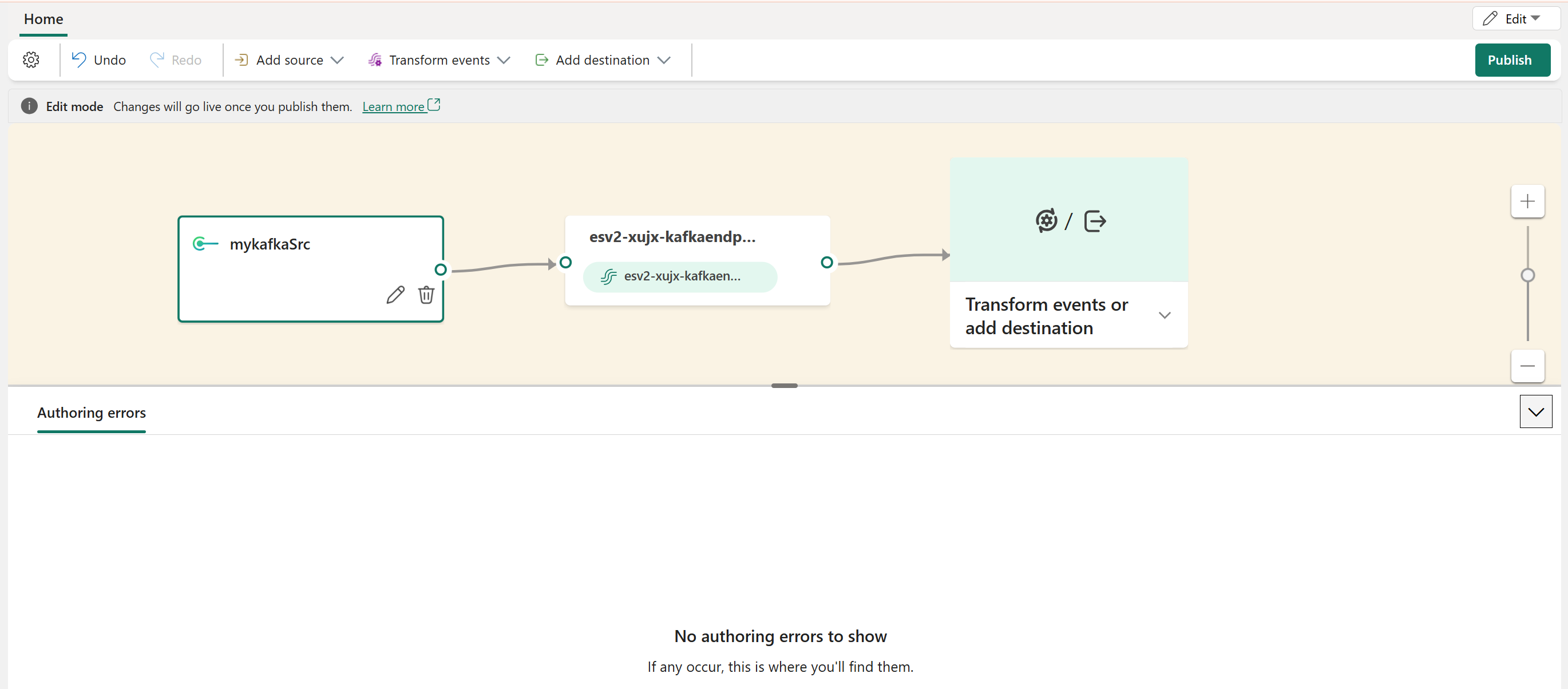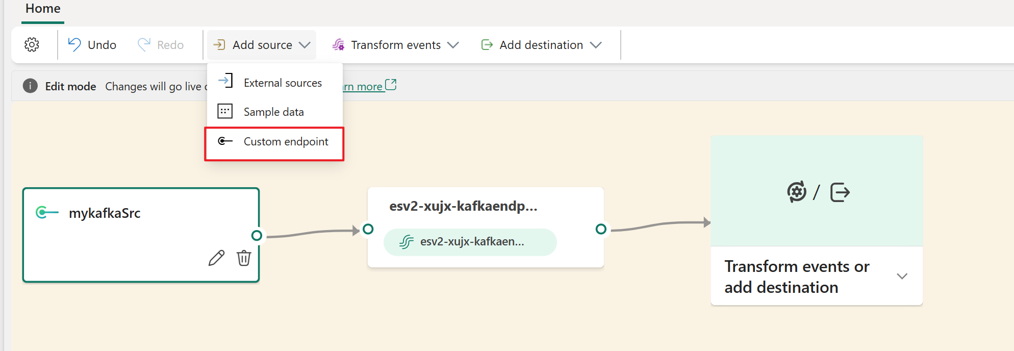 Check that the custom endpoint source appears on the eventstream's canvas in edit mode, and then select Publish.
