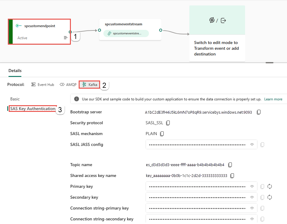 From the SAS Key Authentication page, you can get the important Kafka endpoint information: