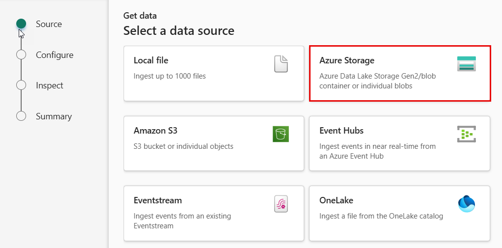 Select the data source from the available list. In this example, you're ingesting data from Local file.