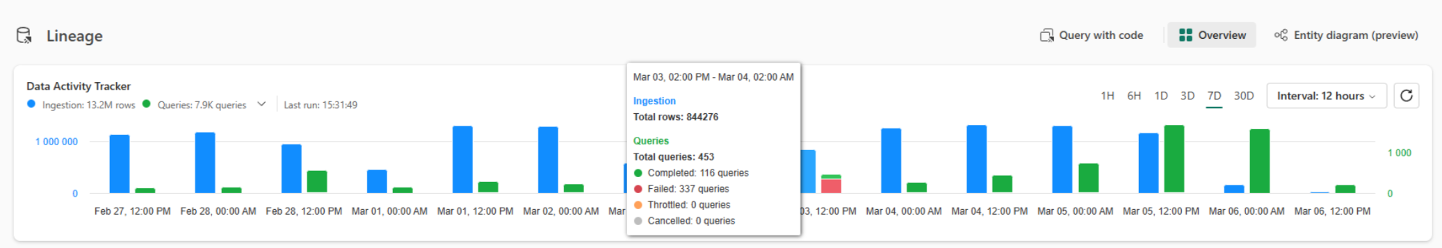 | Queries | The number of queries that ran in the database in the selected time range. Select Queries to view only query data. Select again to view both query and ingestion data . If there are failed, throttled, or canceled queries, you can open the dropdown menu to view them as a percentage compared to the total queries.