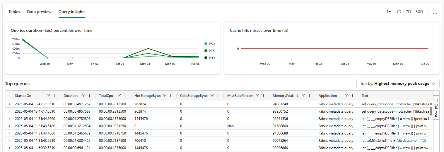 | Query insights | Shows query duration, cache hit misses over time, and top queries. * Queries duration (sec) percentiles over time: The query duration percentiles represent the duration values in seconds or milliseconds, below which 50%, 75%, and 90% of the query durations fall, respectively. To see the query duration details at a specific point in time, hover over the graph and the details pop up. * Cache hit misses over time (%): High cache miss percentage indicates requested data wasn't in cache, leading to longer query durations. * Top queries: A list of queries that can be sorted according to most recent, longest duration, highest CPU usage, highest cold storage usage, or highest memory peak usage. You can also filter the queries by complete, failed, throttled, or canceled. To sort, use the Top by: menu.