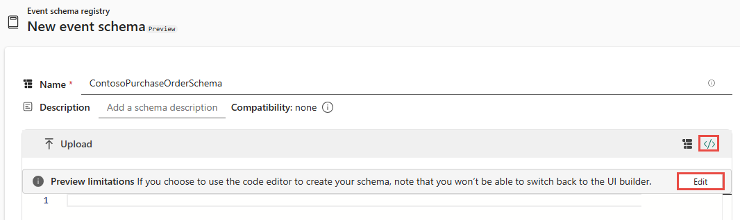 To build a schema by entering JSON code, select Code editor option as shown in the following image. If you see the message: If you choose to use the code editor to create your schema, note that you won’t be able to switch back to the UI builder, select Edit.