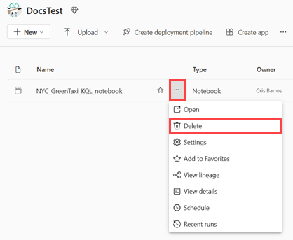 In your workspace, hover over the notebook you want to delete, select the More menu [...] > Delete.