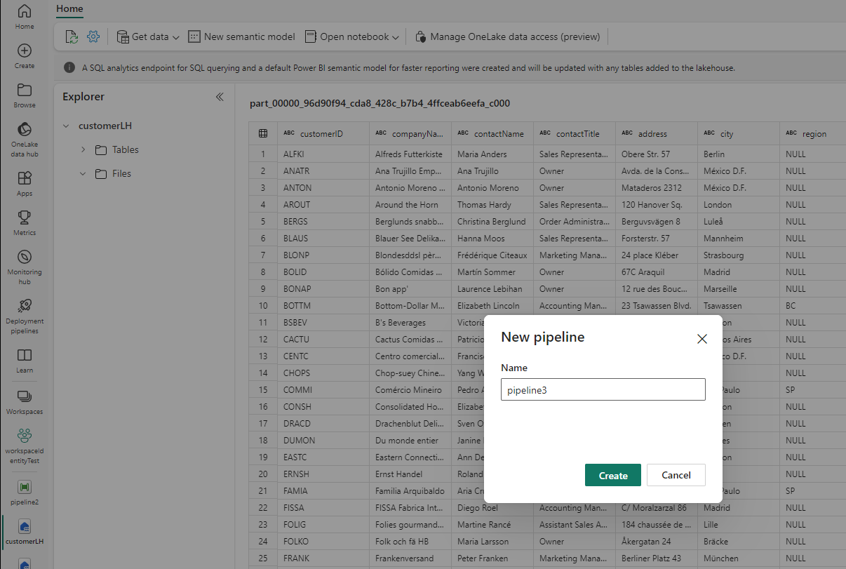When the pipeline status changes from Queued to Succeeded, go to the lakehouse and verify that the data tables were created.