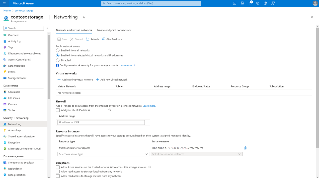 To limit and protect access to firewall-enabled storage accounts from certain Fabric workspaces, you can set up resource instance rules to allow access from specific Fabric workspaces.