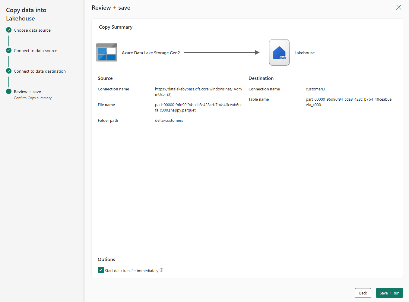 On the Review + save screen, select Start data transfer immediately. When done, select Save + Run.