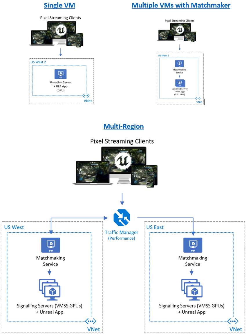 Below are a few recommended architectures to consider when deploying Pixel Streaming to Azure, from a Single VM , Multiple VMs with the Matchmaker service, and a Multi-Region approach.