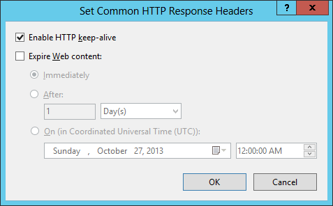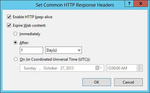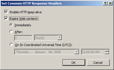 In the Set Common HTTP Response Headers dialog box, check the box to expire Web content, select the option to expire after a specific interval or at a specific time, and then click OK.