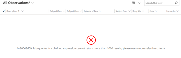 The Azure API for FHIR limits the subquery results to 1,000 records. If the subquery isn't selective enough, the FHIR server returns an error and no results. For example, changing the last name filter to "Smith" in the same example results in the following error: