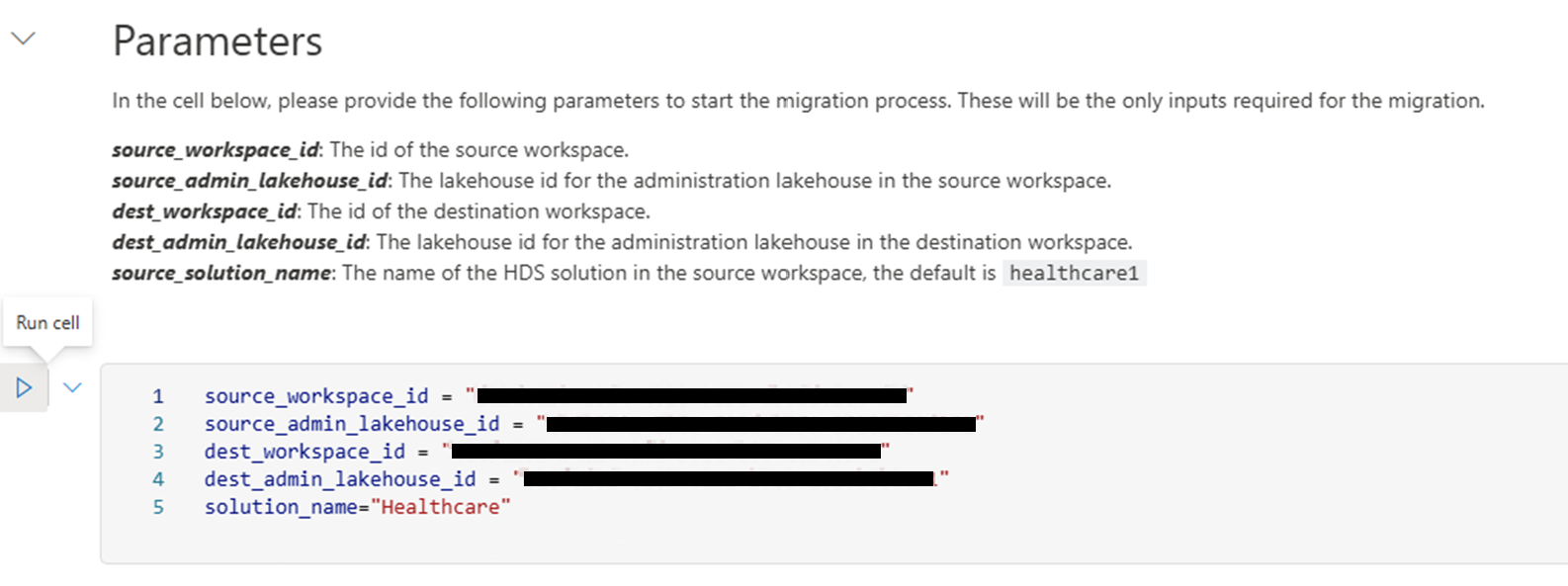 Open the notebook and complete the parameters section using values from the HDS ALM Dev and HDS ALM Dev 2 workspaces.