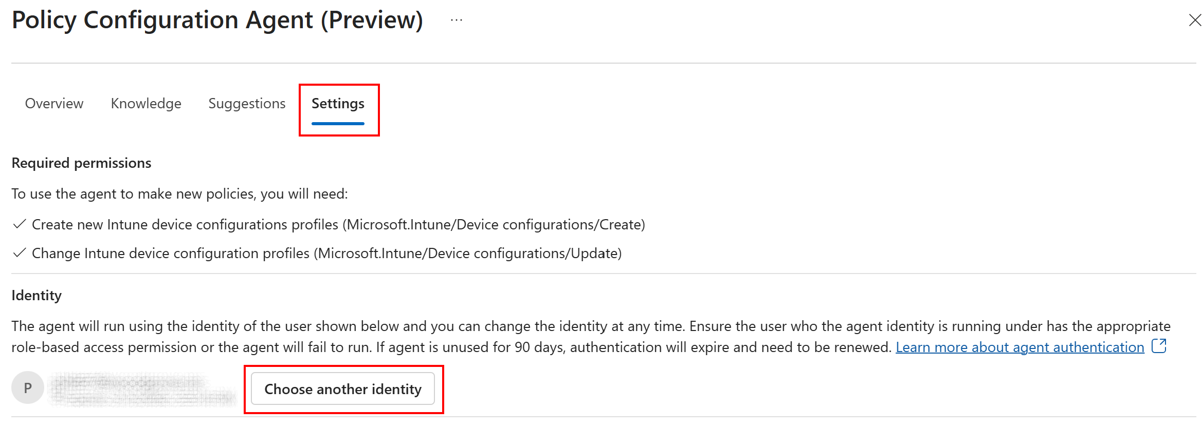 To reauthorize the agent identity, select Renew authentication. When you renew the agent authentication, the agent automatically uses the signed-in credentials. If you don't want to use the signed-in credentials, then select the agent > Settings tab > Choose another identity.