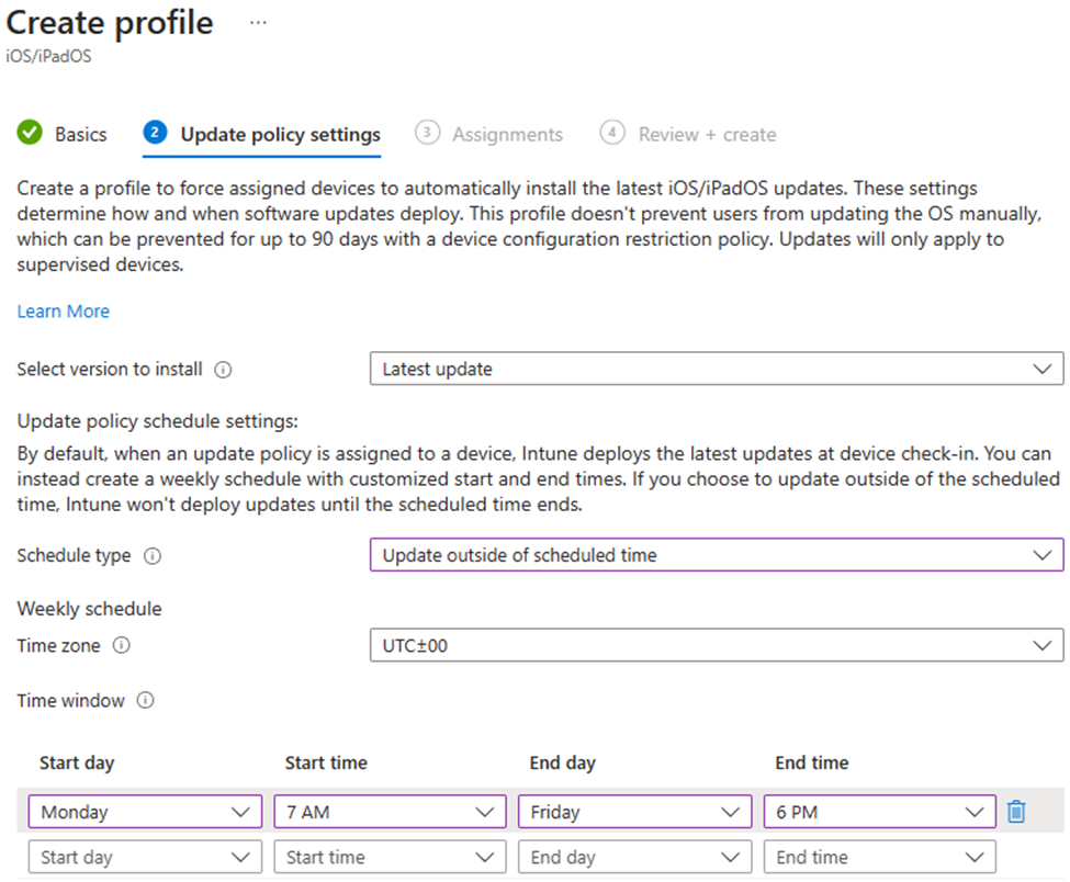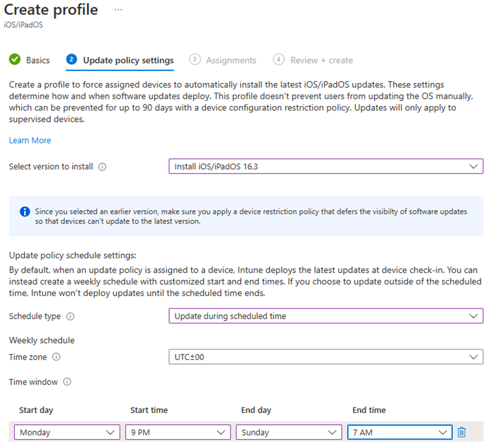 These settings are configurable in the Microsoft Intune admin center. For more information, go to Manage iOS/iPadOS software update policies in Intune.