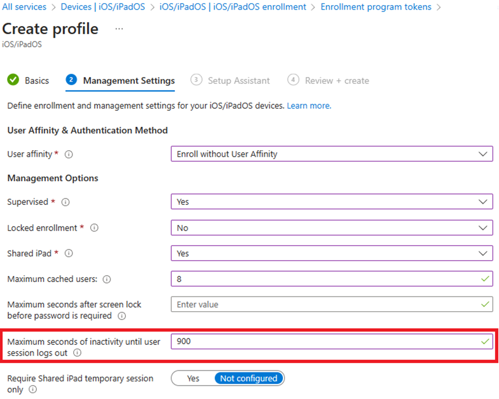 In the first policy, you want all users signed out or want to reboot the device after a set amount of time. You can create an Apple Business Manager enrollment profile to sign out any users who are idle for more than 15 minutes (900 seconds):