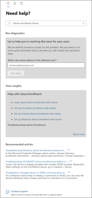 For example, for Microsoft Intune you might enter device enrollment failure. With these criteria, your results include the option to run diagnostics for a user account: