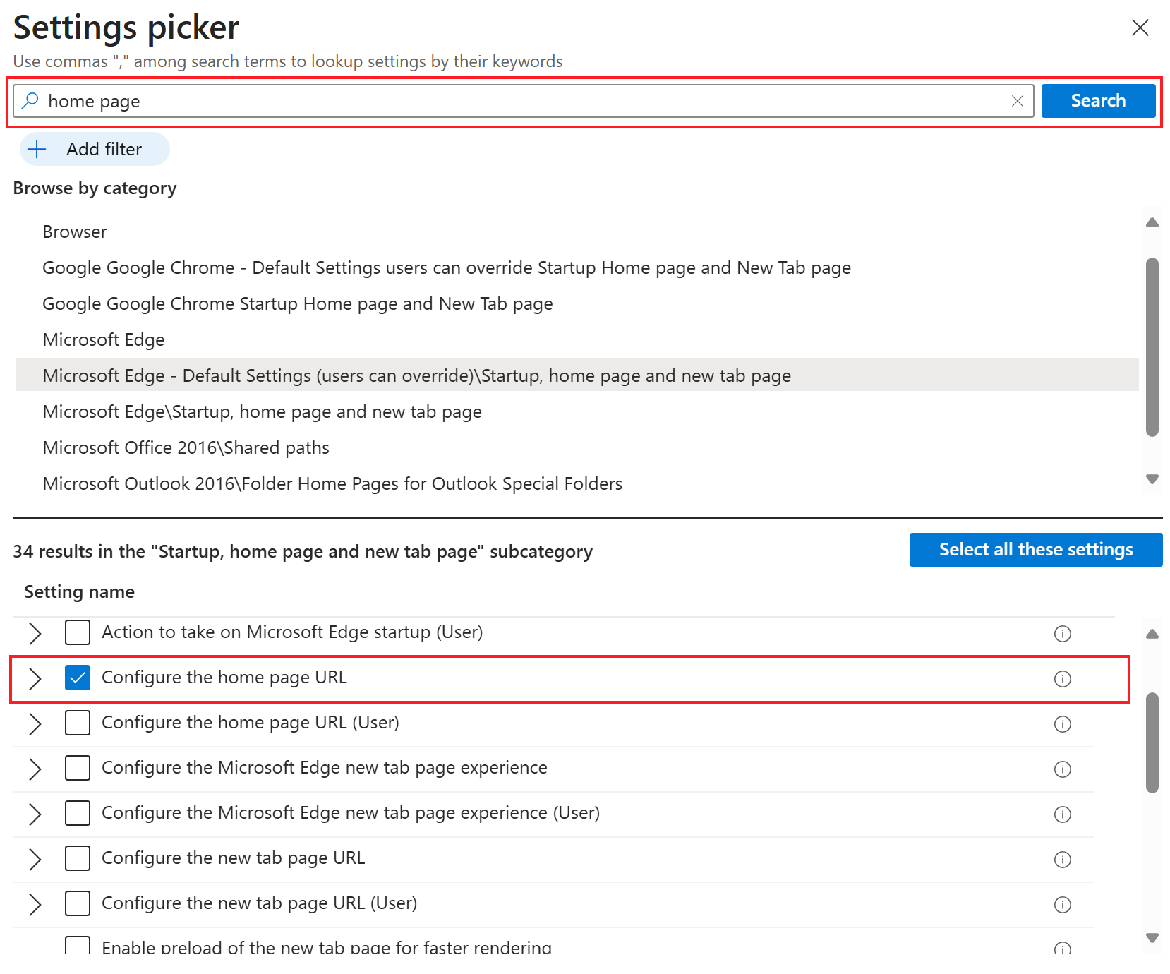 8. In search, find a specific Microsoft Edge setting you want to configure. For example, search for home page, and select the Configure the home page URL setting: