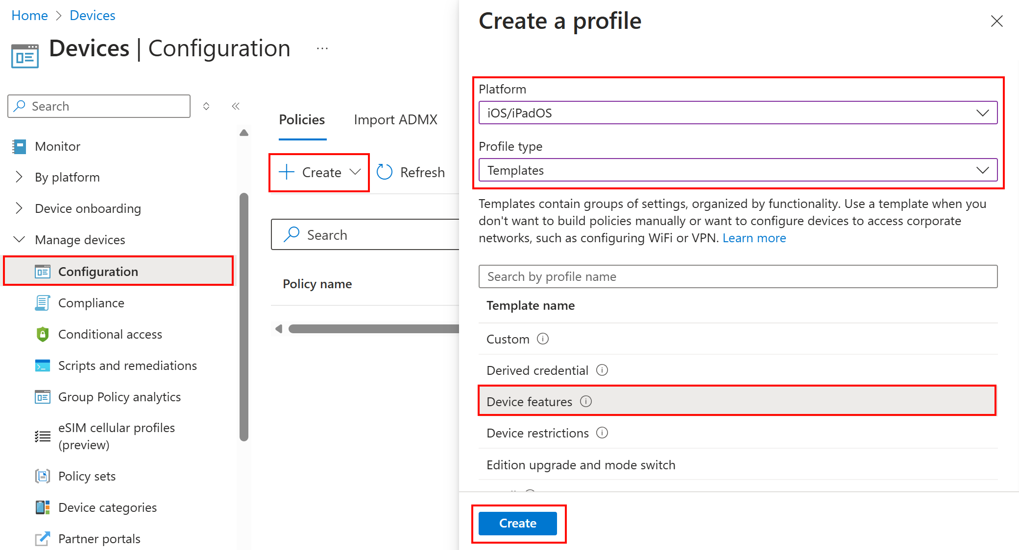 - Profile type: Select Templates > Device features.