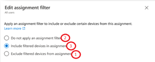 Screenshot that shows filter precedence is excluded, no filter, and then include when assigning policies in Microsoft Intune.