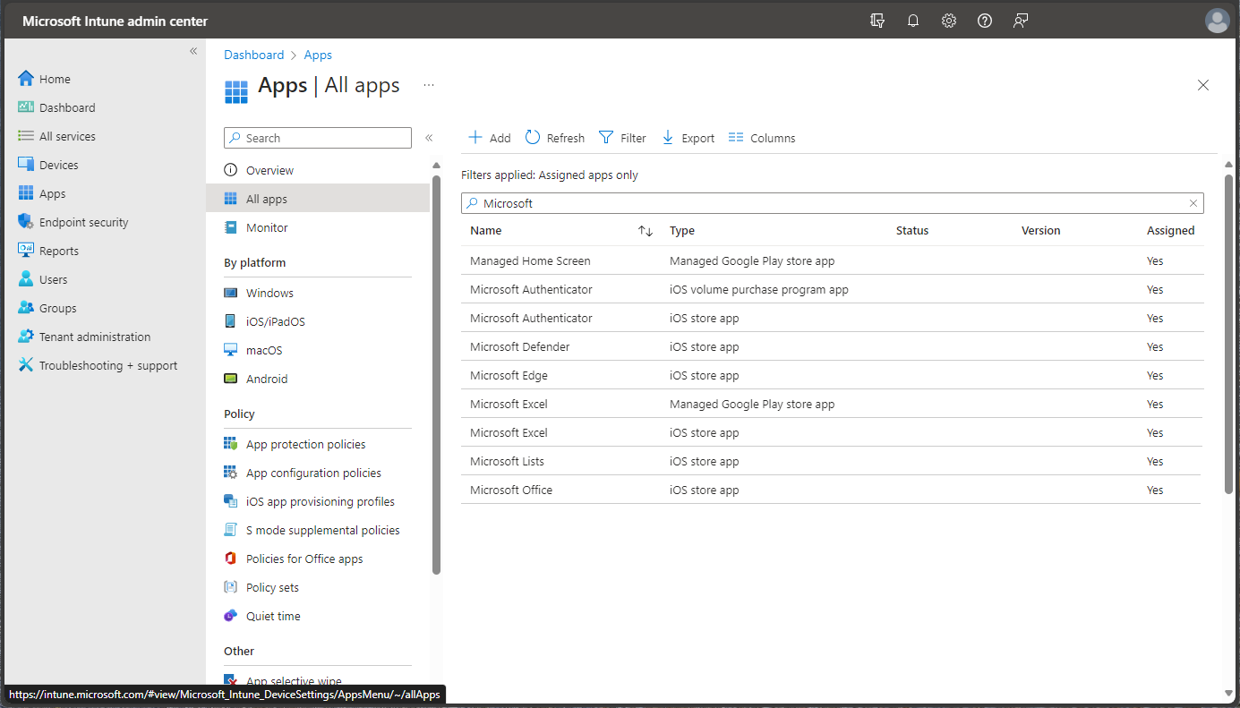 For more information about adding and assigning apps, see Add apps to Microsoft Intune and Assign apps to groups with Microsoft Intune.