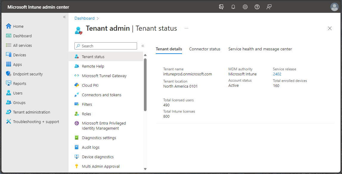 The Tenant admin - Tenant status pane provides tabs for Tenant details, Connector status, and Service health and message center. If there are any issues with your tenant or Intune itself, you will find details available from this pane.