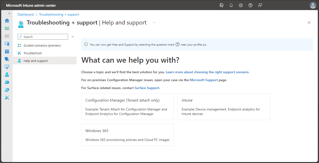 As an IT admin, you can use the Help and Support option to search and view solutions, as well as file an on-line support ticket for Intune.