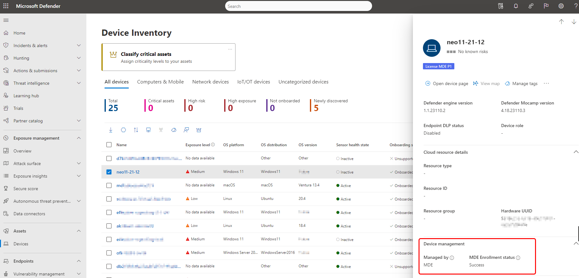 You can use the Microsoft Defender for Endpoint Device inventory to confirm a device is using the security settings management capability in Defender for Endpoint, by reviewing the devices status in the Managed by column. The Managed by information is also available on the devices side-panel or device page. Managed by should consistently indicate that its managed by MDE.