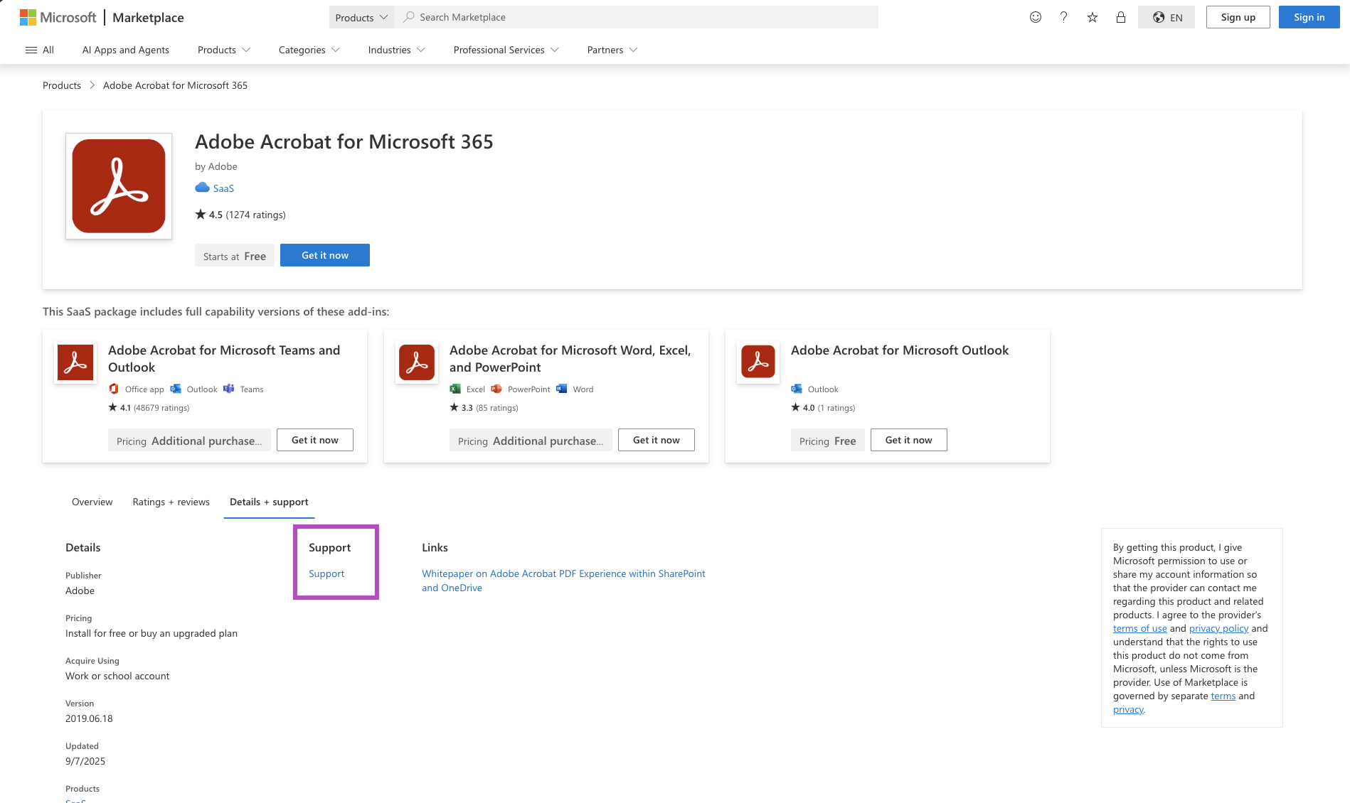 If you haven't yet purchased the product, this takes you to the publisher's support site. If you already deployed the product, you can either use Microsoft's support portal or the support options in the relevant portal you use to complete the deployment (such as the Azure portal or Microsoft 365). Each of these portals has its own support menu. To get support for the product you purchased from a publisher, use that publisher's support site.