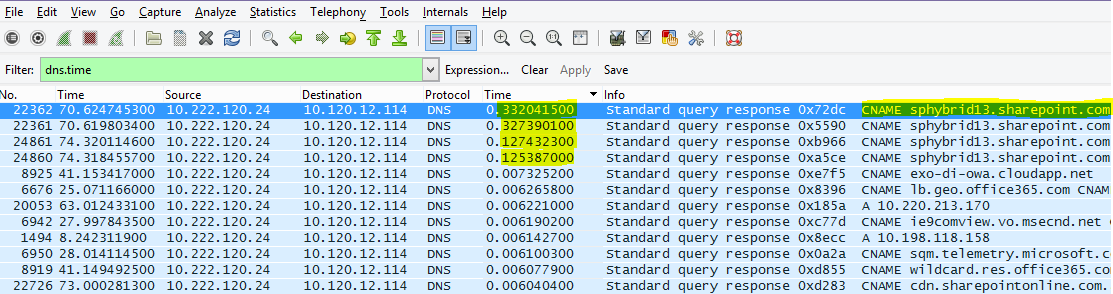 In both Netmon and Wireshark, the most basic filter that will let you look at DNS traffic is simply dns. Be sure to use lower case when specifying the filter. Remember to flush your DNS resolver cache before you begin to reproduce the issue on your client computer. For example, if you have a slow SharePoint page load for the Home page, you should close all browsers, open a new browser, start tracing, flush your DNS resolver cache, and browse to your SharePoint site. Once the entire page resolves, you should stop and save the trace.