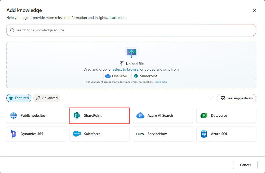 Knowledge sources defined in generative answers nodes take priority over knowledge sources at the agent level. Agent level sources function as a fallback. For instructions on how to add SharePoint as a knowledge source at the agent level, see Add SharePoint as a knowledge source. Agent responses that use SharePoint as a knowledge source at either the topic or agent level aren't included in conversation transcripts.