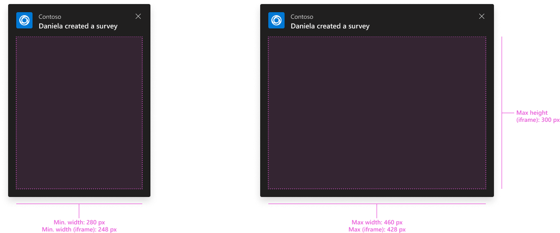 - Height: You can specify the height of the dialog's iframe anywhere within the supported size range. You also can allow users to scroll vertically if your app content exceeds the maximum height.