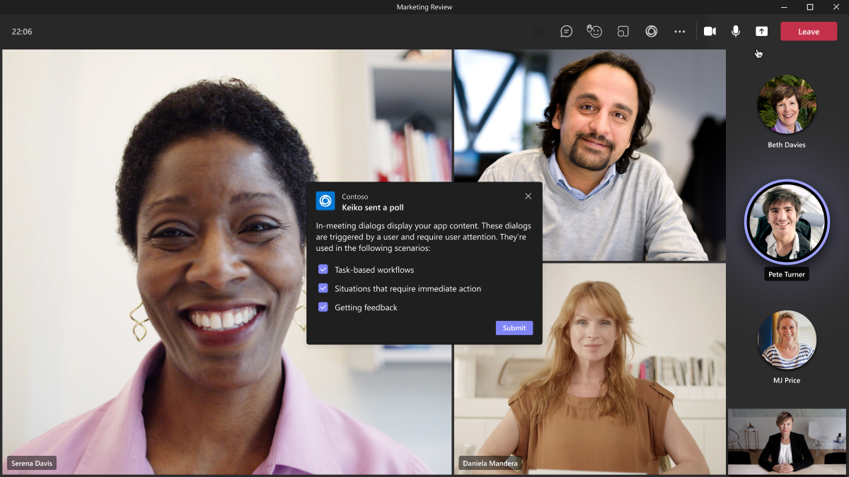 You can create apps to make meetings more productive. For example, ask people to complete a survey during a meeting or send a quick reminder that doesn’t interrupt the flow of the meeting.