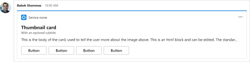You can find more comprehensive design guidelines for Adaptive Cards in Teams, including elements that you can grab and modify as needed, in the Microsoft Teams UI Kit. The UI kit also covers essential topics such as theming, accessibility, and responsive sizing.