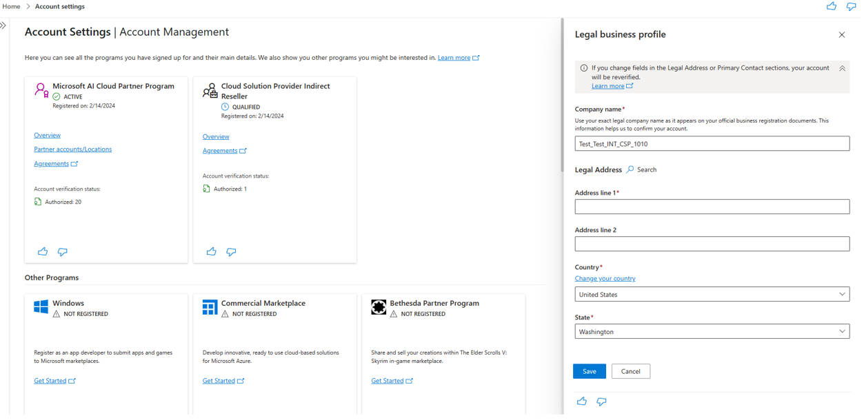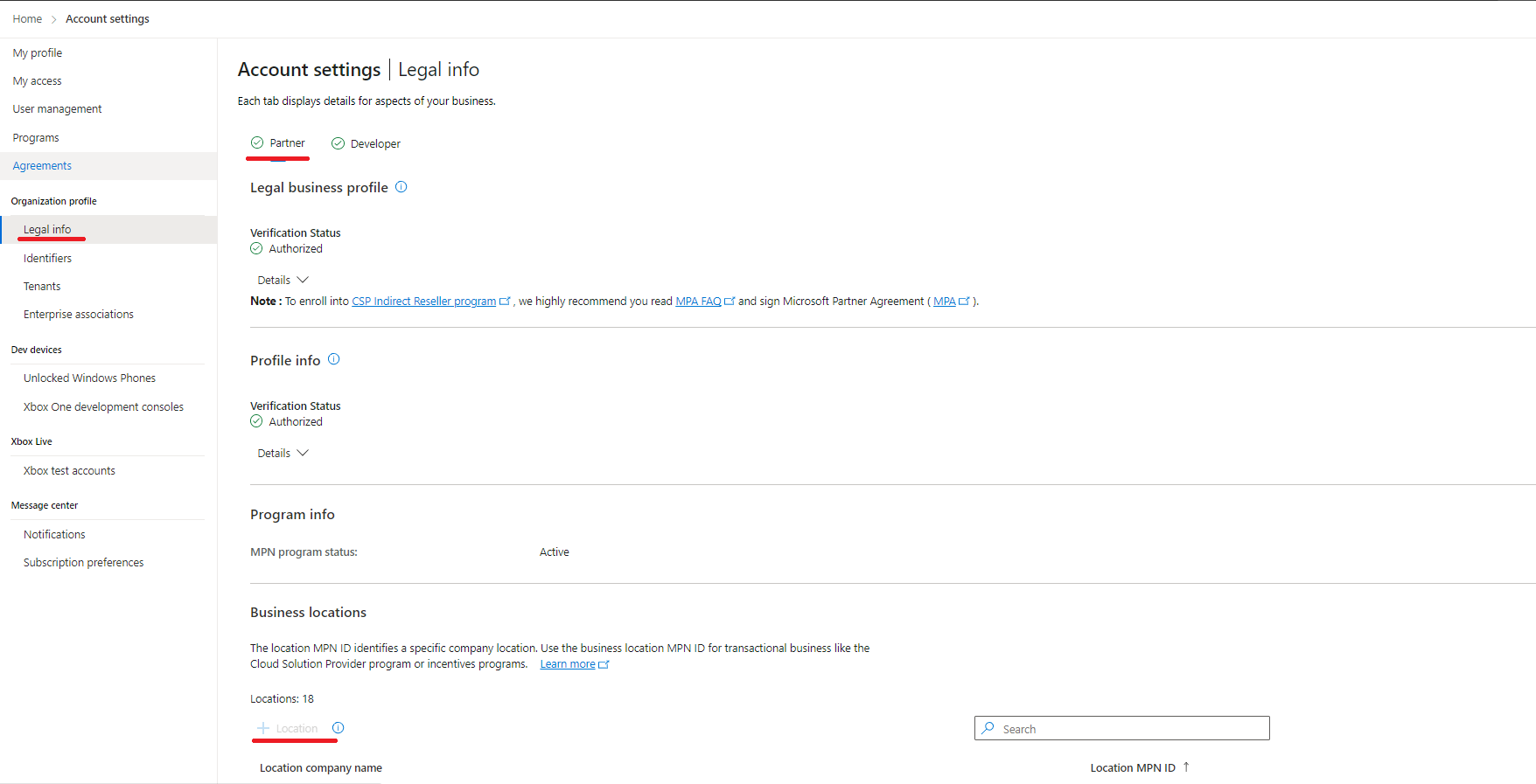 Select Account settings. On the Partner tab, go to Business locations and check the list of locations to ensure that the location you want as your legal entity is listed.