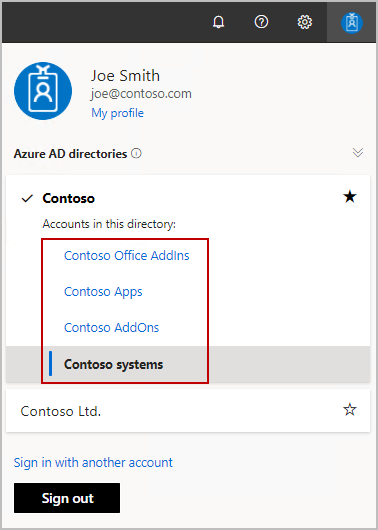 In the following example, the signed-in user is part of the four highlighted accounts. The user can switch between them by selecting an account.