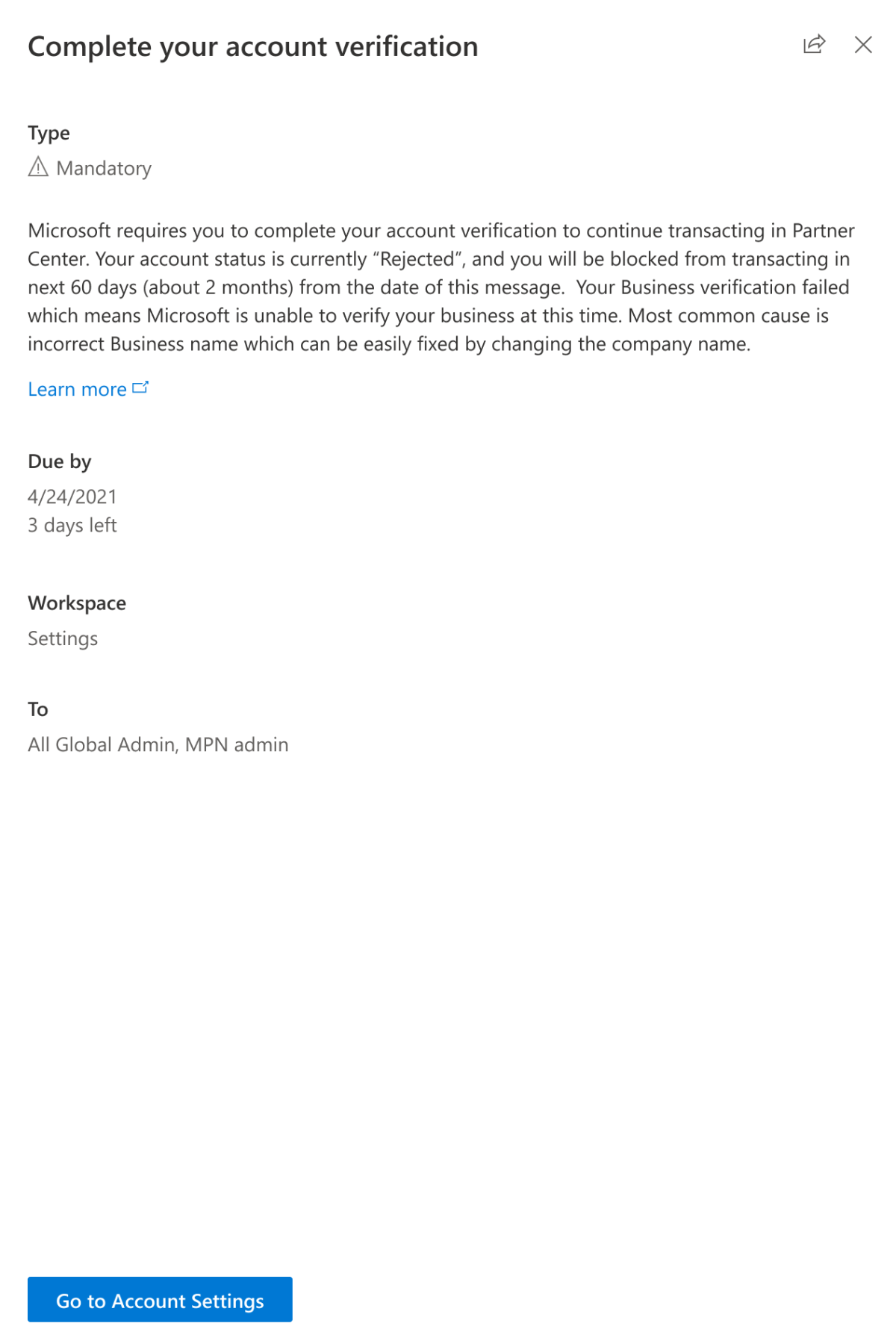 Mandatory actions are tasks that must be completed by a due date, for example, completing your account verification. If you don't complete a mandatory action by its due date that could jeopardize your ability to do business with Microsoft in Partner Center. You can't archive mandatory actions.