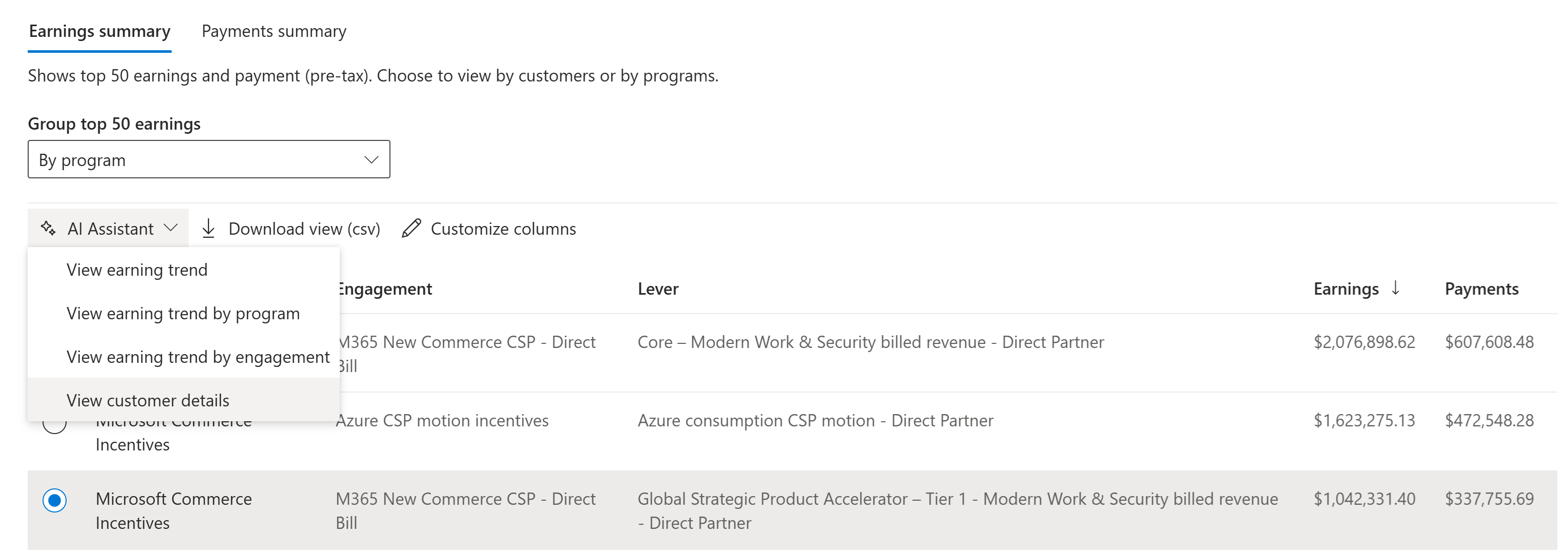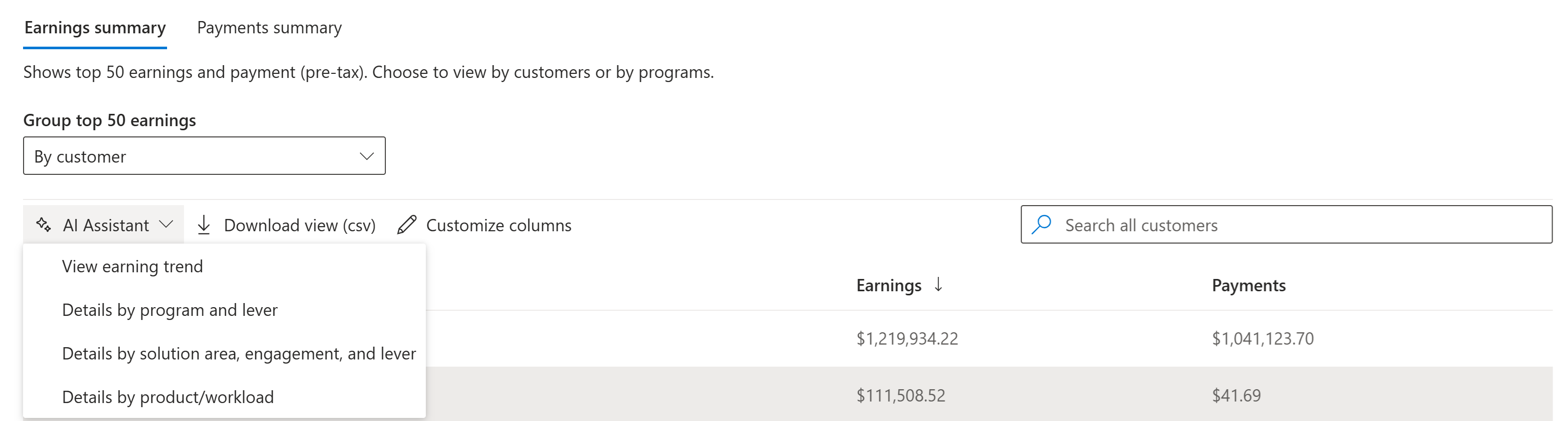 Partner Center AI assistant (preview) Anywhere scenarios are now enabled in the Partner Center Earnings workspace. The AI assistant scenarios enhance user productivity and make reconciliation easier.