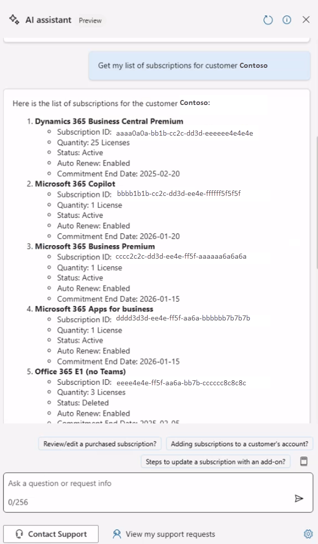 Make sure to replace the"Cancel the duplicate subscription due to an upgrade for customer [customer ID]. The upgraded subscription is [subscription ID]." OR "Reduce the license count of the duplicate subscription due to an upgrade for customer [customer ID]. The upgraded subscription is [subscription ID]."[customer ID]with the actual customer tenant GUID and the[subscription ID]with the actual subscription GUID. - Follow AI guidance: The AI assistant might ask you questions to clarify other details. Follow the instructions provided in the guidelines.